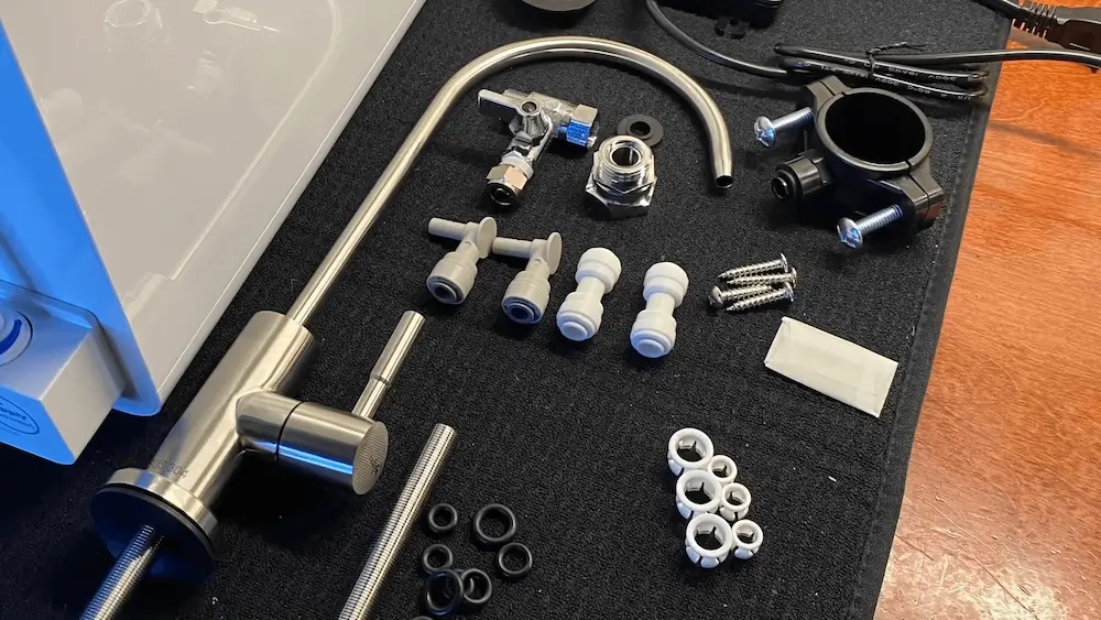 Les accessoires indispensables sont bien présents : tuyaux PE, valve anti-fuite et un testeur TDS basique offert pour vérifier vos résultats.